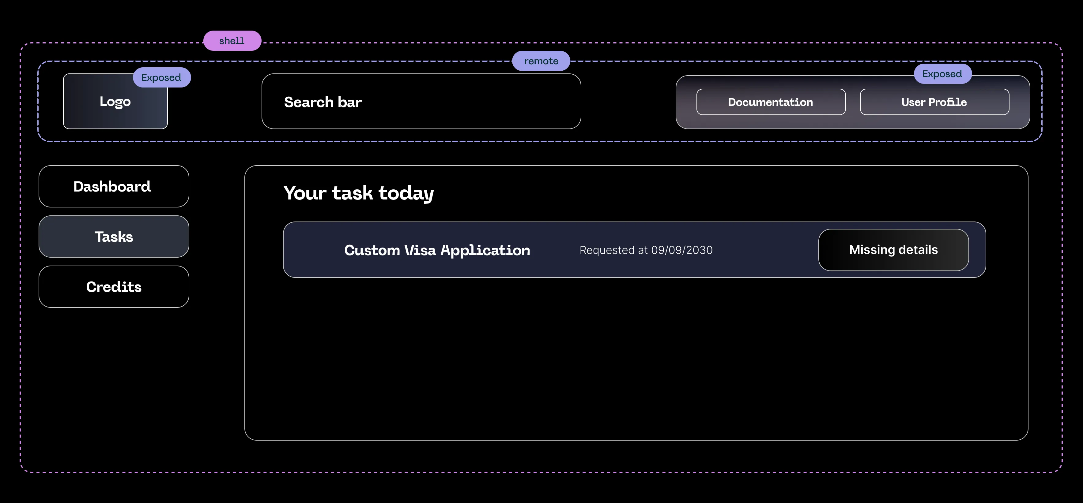 Let's take a look at another example. You have a shell application, within the shell app you have two modules: HeaderNav and TaskContent.